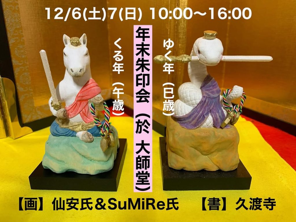 2025.11.26 / 最終更新日時 : 2025.11.26 kimura お知らせ 【ゆく年くる年朱印会】 日時:12/6(土) 7(日) 10:00〜16:00 場所:久渡寺大師堂(旧久渡寺のラーメン屋さん) 画担当:仙安氏、SuMiRe氏 書担当:久渡寺(住職法務の時は代理) まだまだ準備途中ですが、大師堂が仮スタートします。 少しずつ整備を続けますので宜しくお願い申し上げます。 12/6(土) 9:30頃より大師堂にてご法楽を修します。